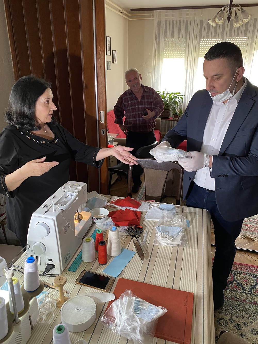 „Син, снаја, супруг цртају и режу материјал, а ја шијем. Маске су од памучног материјала и вишекратну употребу, могу се прати и дезинфиковати пеглом. За сада материјал имамо. Оставила сам све по страни како би дуже била поред машине и сашила више маски. Нон-стоп добијам поруке да треба још“, казала је Надица Јоргић.